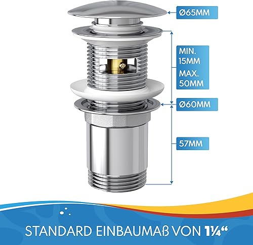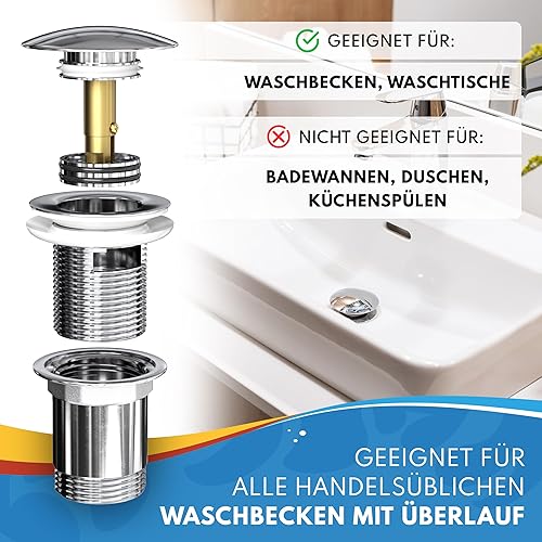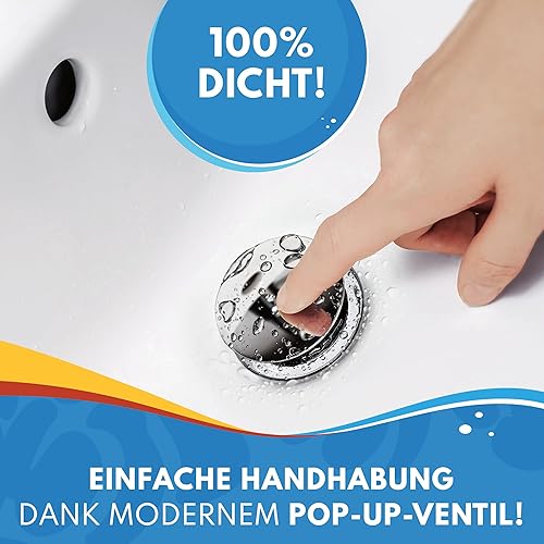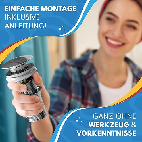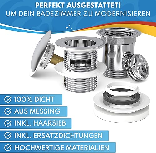 ABFLUSSHELD Ablaufgarnitur Waschbecken mit Überlauf - Hochwertiges Ablaufventil mit Haarsieb und Ersatzdichtungen - Langlebige Pop Up Ablaufgarnitur - Waschbeckenablauf mit Standardmaß