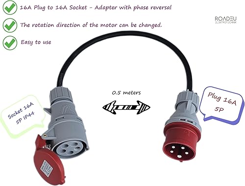 RoadEu - CEE Adapter 32A auf 32A mit Phasenwender - Starkstrom Adapter 32A Stecker auf 32A Kupplung - 0,5 Meter - CEE Verlängerungskabel