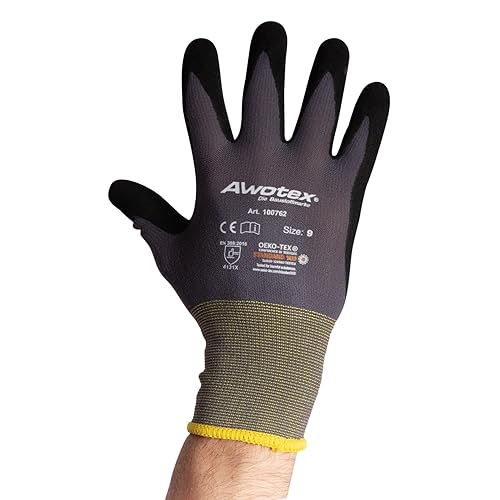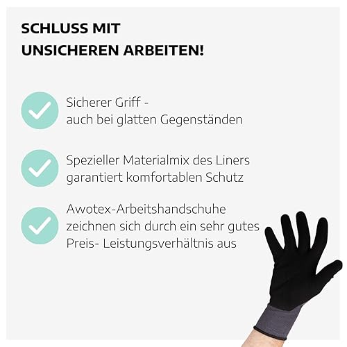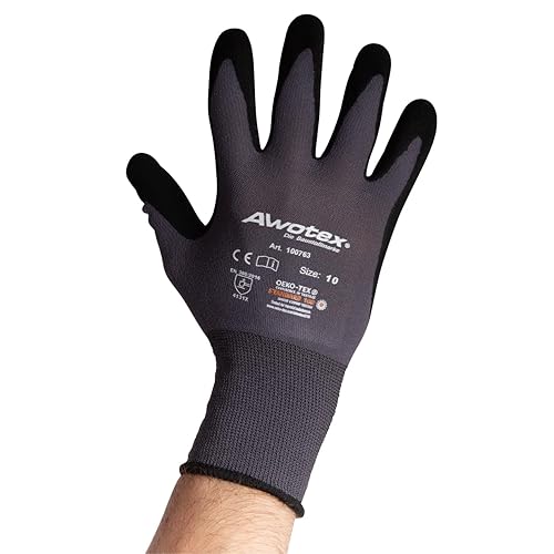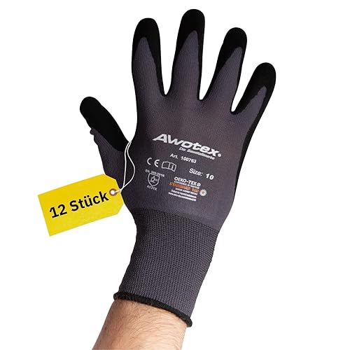 AWOTEX Montagehandschuh Nitril Größe 10 I 12 Stück Arbeitshandschuhe mit Nitrilschaum-Beschichtung I Gummi Handschuhe I Work Gloves 90% Nylon I Handschuhe Arbeitshandschuhe wasserdicht