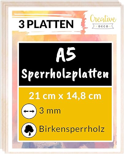 Creative Deco 3 x A5 Sperrholzplatte 3mm | 148 x 210 (+/- 0,5) mm | Birkensperrholz Dünne Holz-Zuschnitte | Perfektes Blatt für Laubsäge, Brandmalerei, Laserschnitt, CNC Router, Durchbrochenes