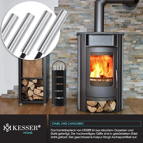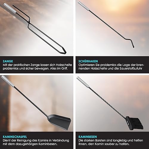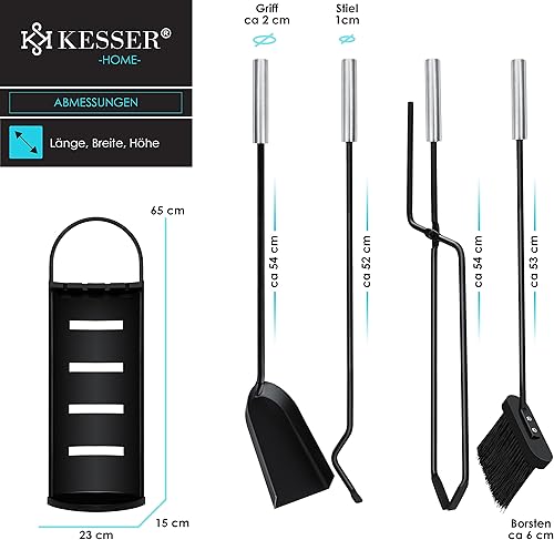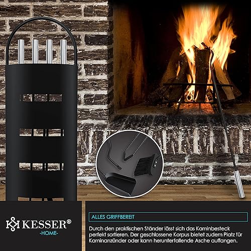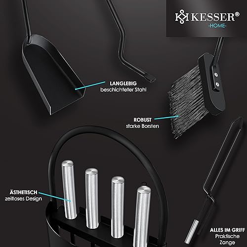 KESSER® Kaminzubehör 5-teiliges Kaminbesteck Set | Modern Design, beschichtet, Hochwertige Kamingarnitur aus 5 Teilen: Besen, Schaufel, Schürhaken, Zange, Ständer mit Sichtschutz Edelstahl Schwarz