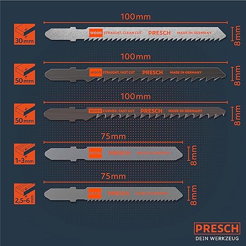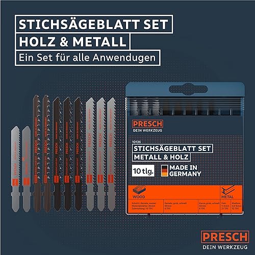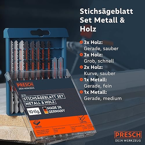 Presch Stichsägeblätter Set Metall & Holz 10 Stk. - Stichsägeblatt Set für alle Anwendungen - Profi Stichsägeblatt Set - Universalschaft für jede Stichsäge - Präzises Sägeblattsortiment