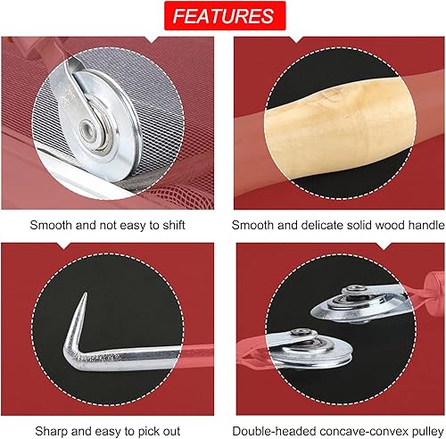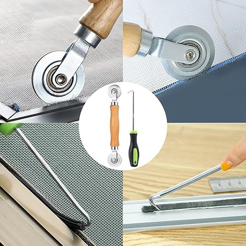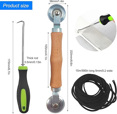 Werkzeug Doppelrad Dichtungseinroller mit Holzgriff, Einzieher Einroller Sieb Fenster Spline Roller Haken Werkzeug, 15m x 5mm Gummi Kederband, als Fliegengitter Insektenschutz Ersatzteil (3)