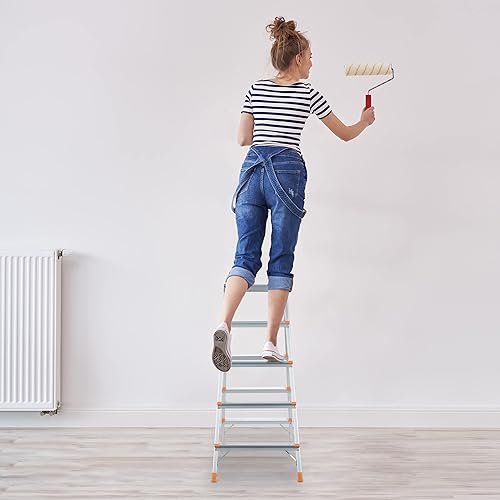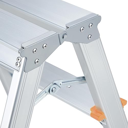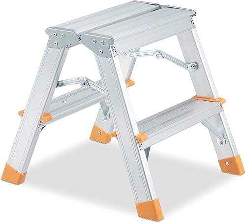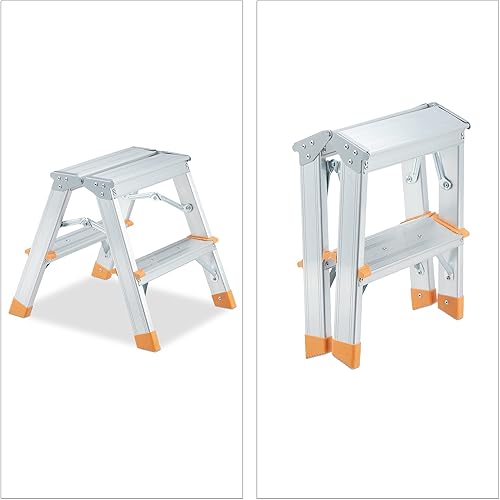 Relaxdays Trittleiter, Aluminium, klappbar, 4 Stufen, Leiter bis 150 kg, beidseitig begehbar, Stehleiter, Silber/orange