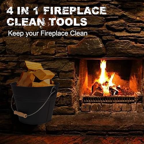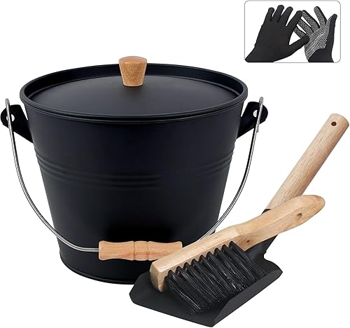 BRIAN & DANY Ascheeimer mit Deckel, Runder Kohleeimer für Kamine, 5L Eimer mit Schaufel und Handbesen, Werkzeugset Zubehör für Kamin, Feuerstelle, Holzofen
