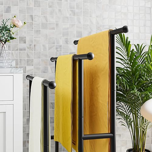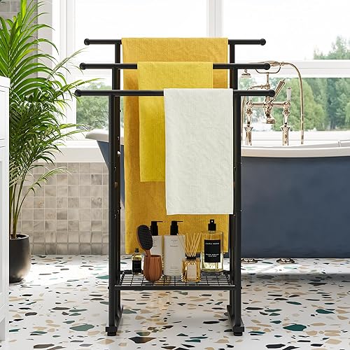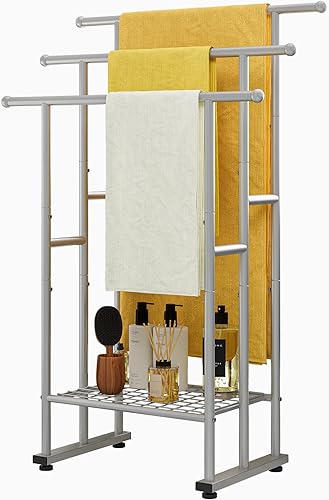 FOUBAM Handtuchhalter, Handtuchständer, Handtuchleiter stehend mit 3 Handtuchstangen, für Badetücher, Decken, platzsparend, Stabil, Industriestil,Badezimmer Badetuchhalter Stahl, Silber