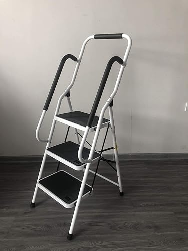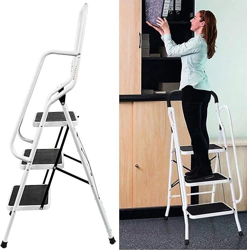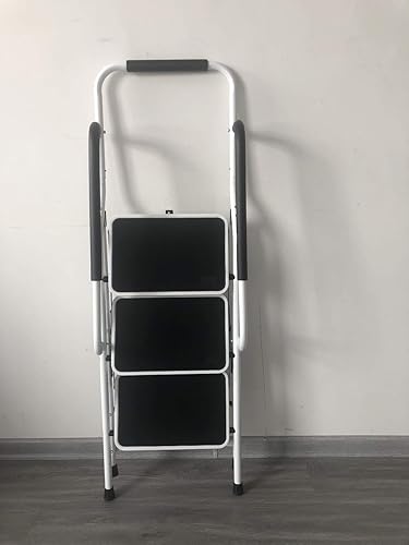 Trittleiter 3 Stufen klappbar mit Handlauf, Klapptritt aus Stahl mit Haltebügel und gummierten Stufen, Stehleiter - einfach zu verstauen, Klapptreppe bis 150 kg