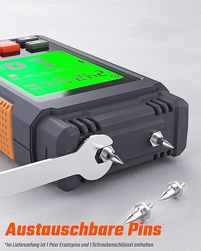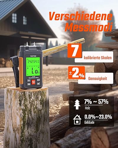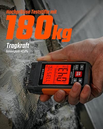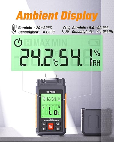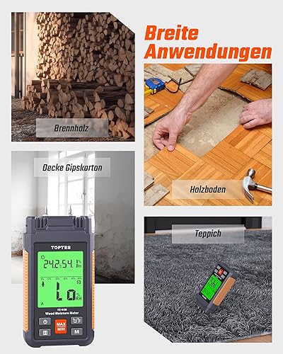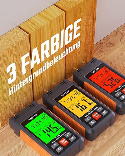 TopTes Feuchtigkeitsmessgerät, Feuchtigkeitsmesser für Wand und Holz TS-630, Großes LCD-Display Dreifarbiger Hintergrundbeleuchtung, 7 Kalibrierungsskalen Holzfeuchtemessgerät mit Batterien - Pin-Typ
