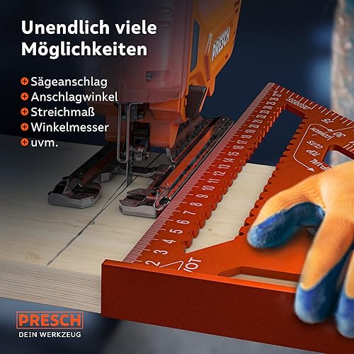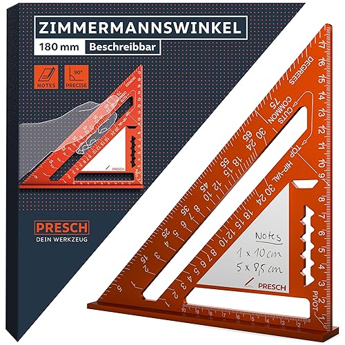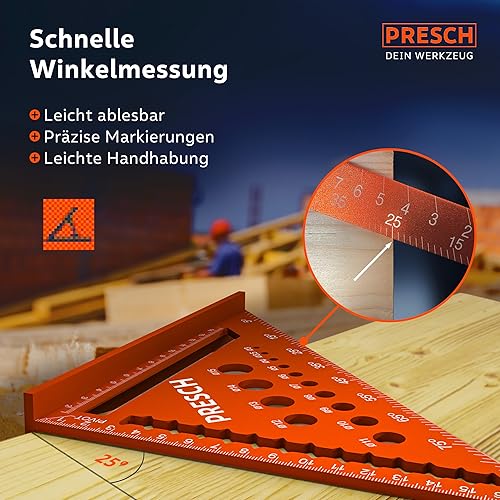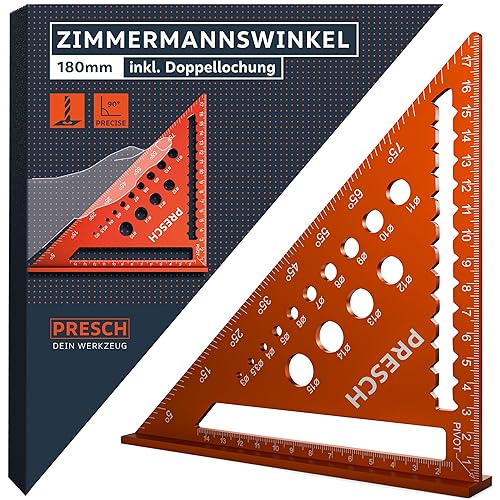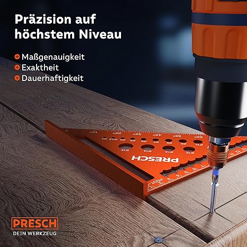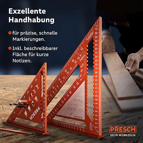 Presch Zimmermannswinkel Set - 180mm & 300mm - Innovative, abwischbare Notizfläche - Intelligente Bohrlehre für exakte Durchmesser - Hochpräzise gefrästes Aluminium für exakte 90° Winkel