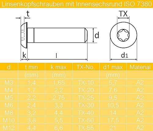 Techtanium® Linsenkopfschrauben M8 x 25/25 mm mit Innensechsrund aus Edelstahl A2 (20 Stück) | Versch. Größen & Verpackungseinheiten verfügbar | Halbrundkopfschrauben | Linsenschrauben | ISO 7380