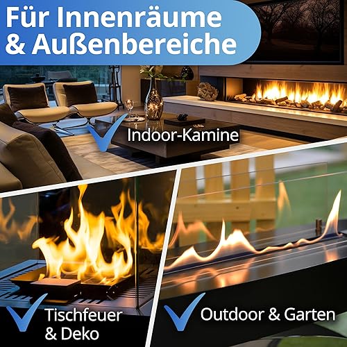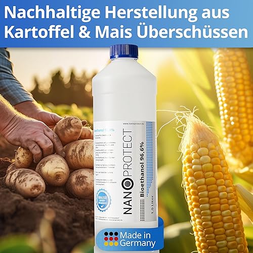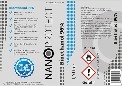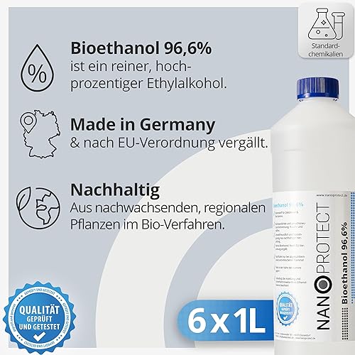 Nanoprotect Bioethanol 96,6% | 6 x 1 Liter | Flüssiger Ethanol Brennstoff für Indoor Kamin und Tischfeuer | Reiner Ethylalkohol als Lösemittel | Geprüfte Premium Qualität
