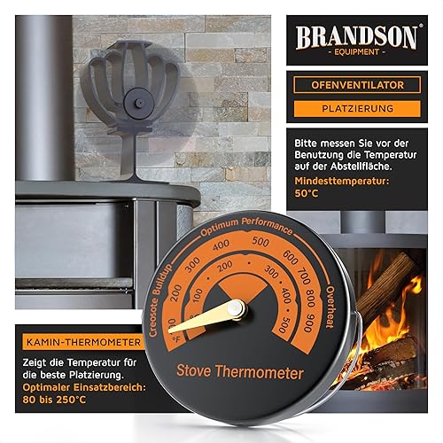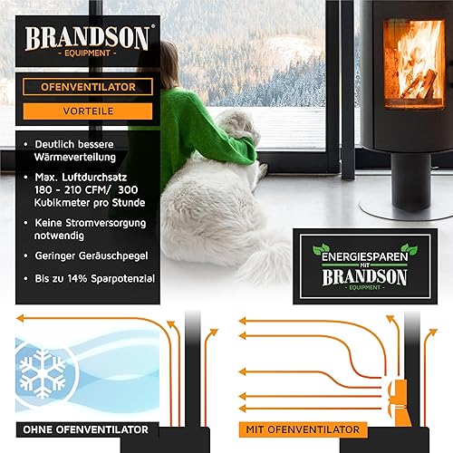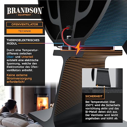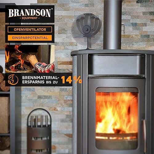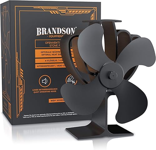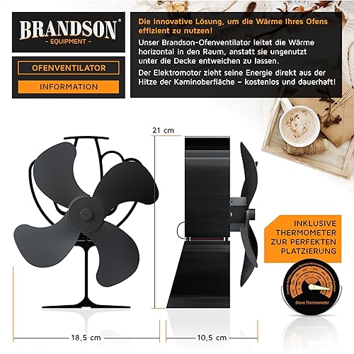 Brandson - wärmebetriebener Kaminventilator - Ofenventilator - Lüfter für Kaminöfen Holzöfen Öfen - 4 Flügel Rotorblätter – Rotordurchmessser 180mm – Wärmeverteiler ohne Strom – schwarz