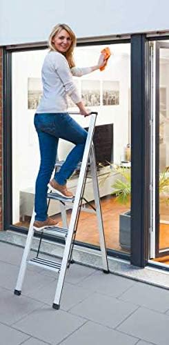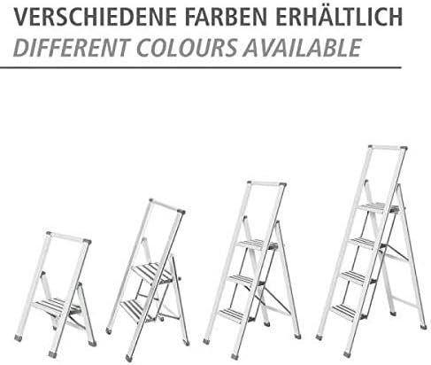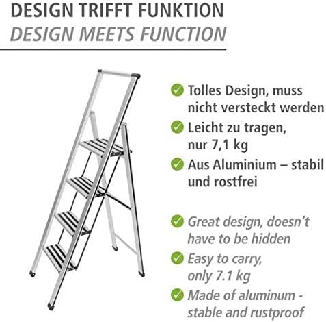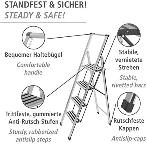 WENKO Leichte Aluminium Trittleiter mit 4 Stufen für 100 cm höheren Stand, rutschsichere XXL-Stufen, Design Klapptrittleiter mit 44 x 153 x 5,5 cm in matt Silber, TÜV Süd Zertifiziert