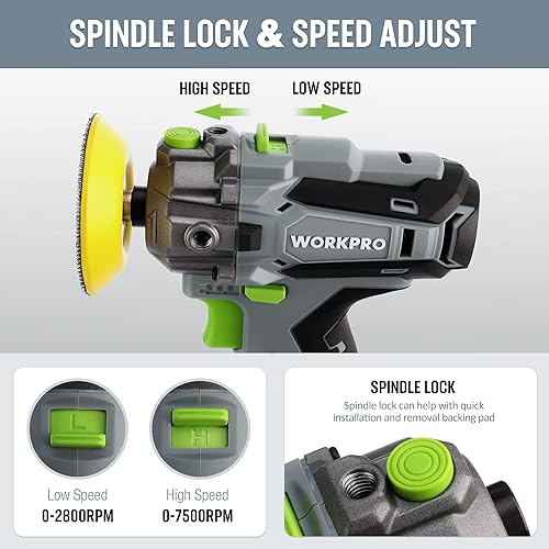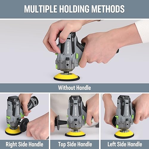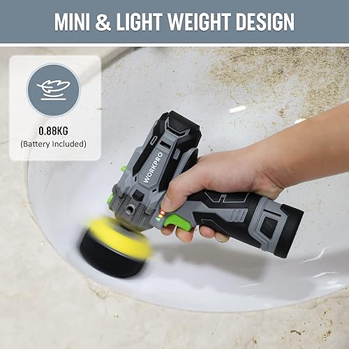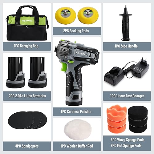 WORKPRO Mini Poliermaschine, 12V Akku Poliermaschine, Auto Poliermaschine Polierer 7500RPM, 2 x 2,0Ah Batterien, 1 Stunde Schnellladung, 75mm Polierschwamm + Wollscheibe, für Auto, Möbeln, Metall