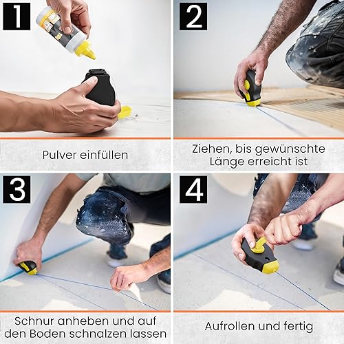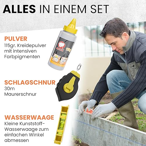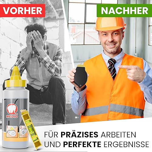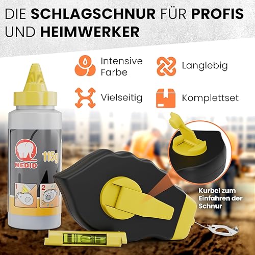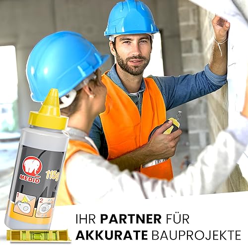 MEDID Schlagschnur-Set - 30 Meter Maurerschnur - 115 gr. blauer Schlagschnur Kreide - Richtschnur inklusive Schnurwasserwaage – robustes Schlagschnurgerät aus ABS mit Edelstahl Endhaken
