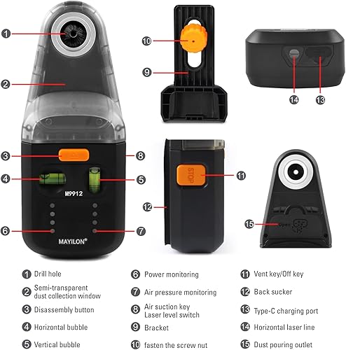 M9912 Staubabsaugung Absaughaube für Schlagbohrmaschine mit Laserebene, Elektrischer Bohrstaubsammler, Wand Saug Vakuum Bohrer Zum Staubfreien Bohren Auf Allen Oberflächen (Für Bohrer bis 13mm)