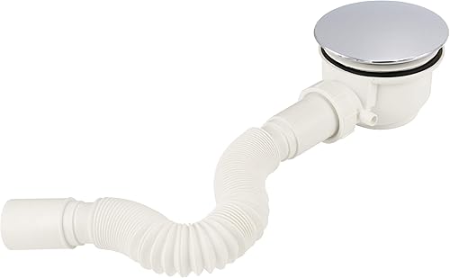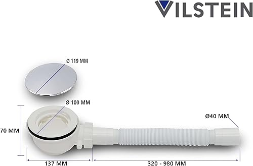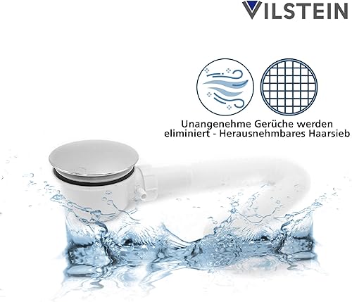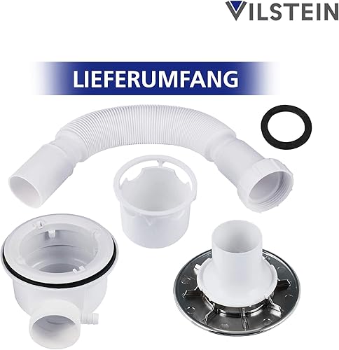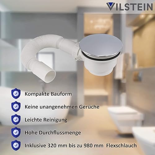 VILSTEIN Ablaufgarnitur Duschwanne 90mm, Siphon mit Geruchsstop und Haarsieb, Duschablauf kompakt mit Flexschlauch, Chrom Abdeckung