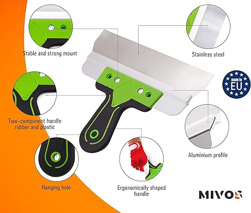 Mivos Edelstahl Fassadenspachtel Breitspachtel 250 x 60 mm - Flächenspachtel mit Aluhalter und Softgriff - Fugenspachtel von Großen Flächen - Glättspachtel Made in EU