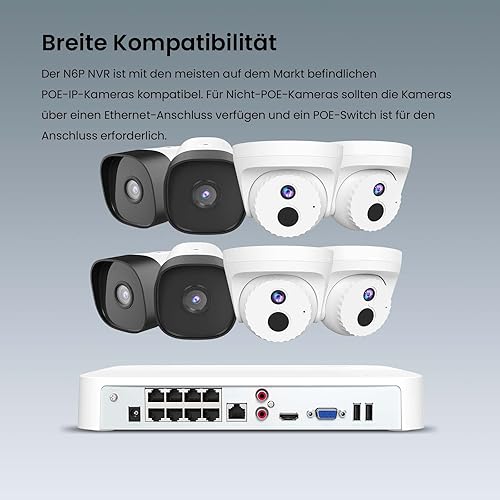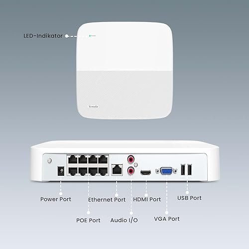 Tenda NVR Überwachungssystem Rekorder 4K, 8CH PoE NVR Recorder, 250m Langstreckenübertragung, H.265+, Plug und Play, HDD(bis zu 10TB)/Cloud Storage, 4KV Blitzschutz, APP Fernüberwachung, N6P-8H