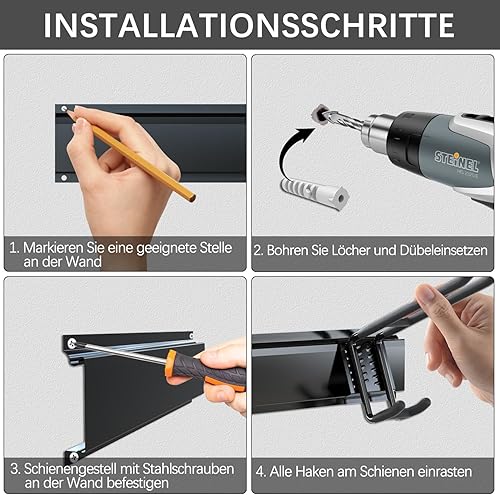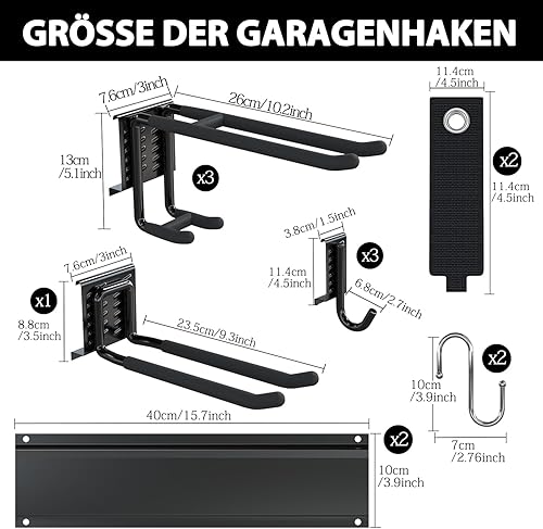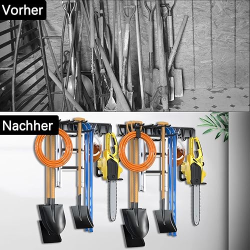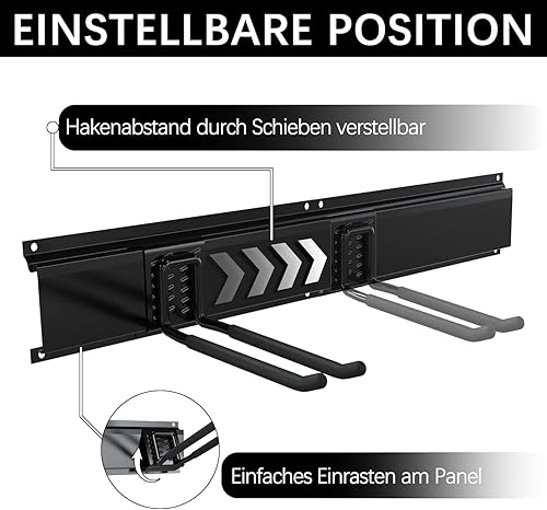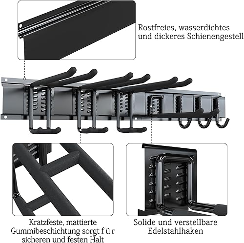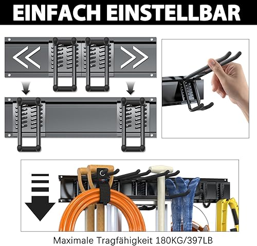3-H Garage Aufbewahrung, 80 cm Einstellbar 7 Wandhaken Garage und 2 S Haken für Gartengeräte,Werkzeughalter Wand Gartengerätehalter für Garage Keller Skiausrüstung Besen Stühl Rechen Schaufel Schwarz