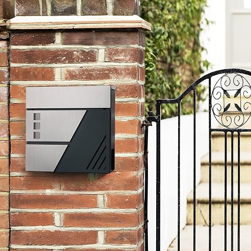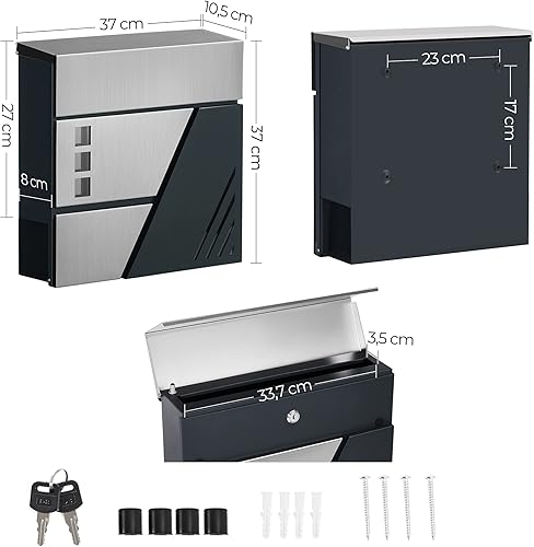 SONGMICS XXL Briefkasten, Wandbriefkasten mit Sichtfenster, aus Edelstahl, für Haustür, mit Schloss und Schlüsseln, silbern-anthrazit GMB053G01