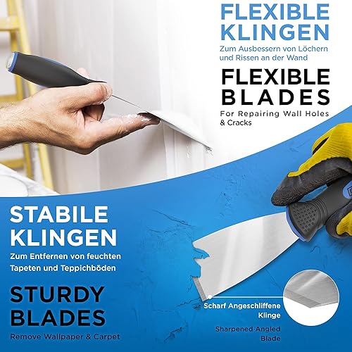 EFFEKTWERK Profi Spachtel Set - 5tlg Spachtel aus rostfreiem Edelstahl - 2x stabil zum Tapeten entfernen mit Anschliff & Metallplatte - 3x flexible Malerspachtel - Maler Werkzeug Spachtelset