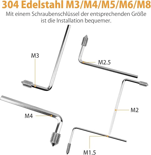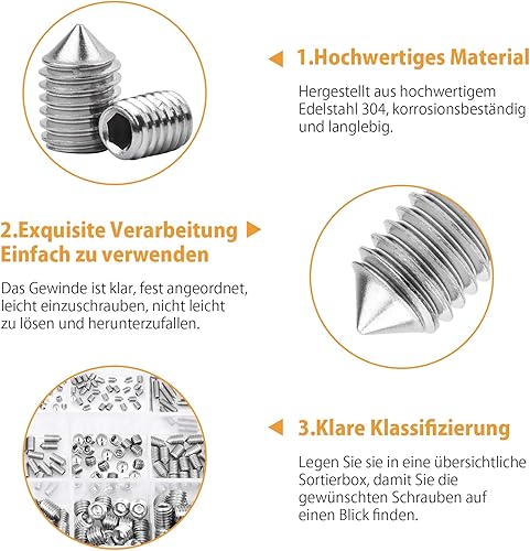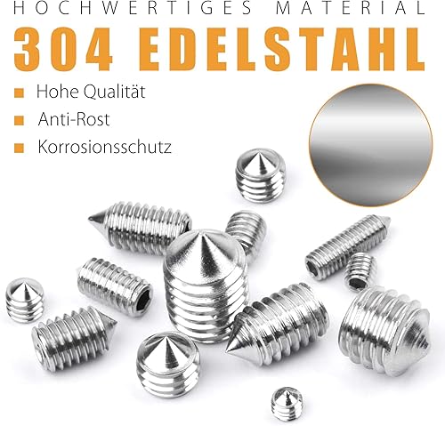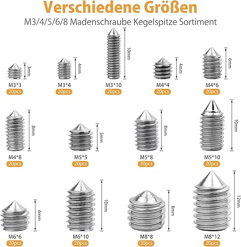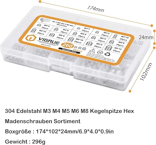 VIGRUE 260 Stück Madenschraube Kegelspitze Hex Madenschrauben Sortiment M3 M4 M5 M6 M8 Edelstahl Einschraubmuffen Sortiment Befestigungsteile Kits mit Sechskantschlüssel