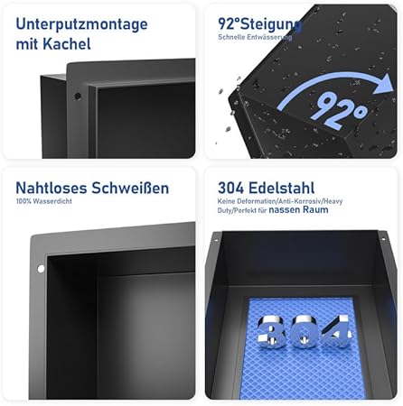 Bernkot Duschnische aus Edelstahl weiß 60 cm × 30 cm × 10 cm keine Fliesen erforderlich Nischendusche für die Badezimmeraufbewahrung versenkte Duschnische, randlos, bündige Montage