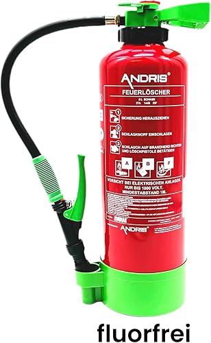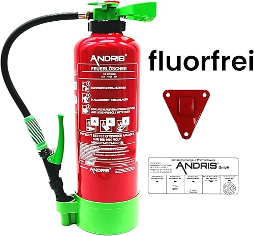 Aufladefeuerlöscher fluorfrei 6L ABF Schaum ANDRIS® (Fettbrand), 27A 144B 25F, EN 3 inkl. Wandhalterung, Standfuß & Orig. ANDRIS® Prüfnachweis für 2 Jahre