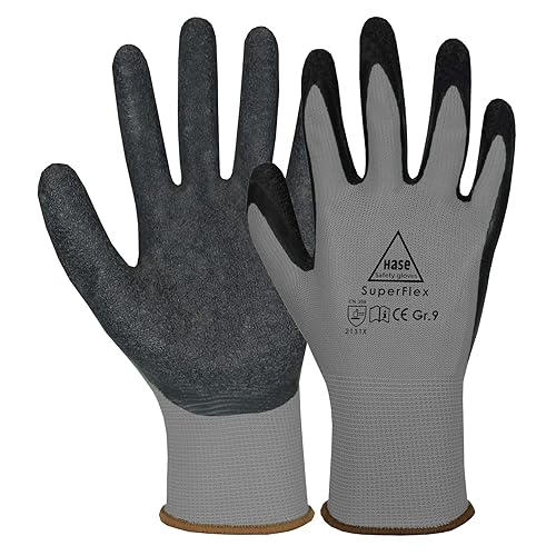 10 Paar Hase Superflex Arbeitshandschuhe mit Latexbeschichtung, Rutschfeste Gartenhandschuhe, Angenehmer, Ideal für Handwerk, Gartenarbeiten, Industrie Grau Gr. M (08)