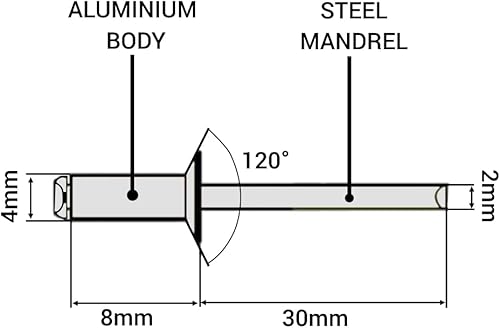 SKIR'CO (100 Stück) Senkkopf Aluminium Blindnieten 4,0 x 8 mm, Stahldorn, Popnieten