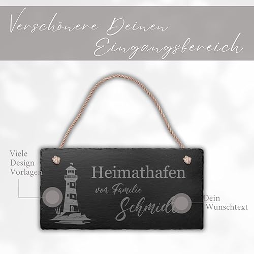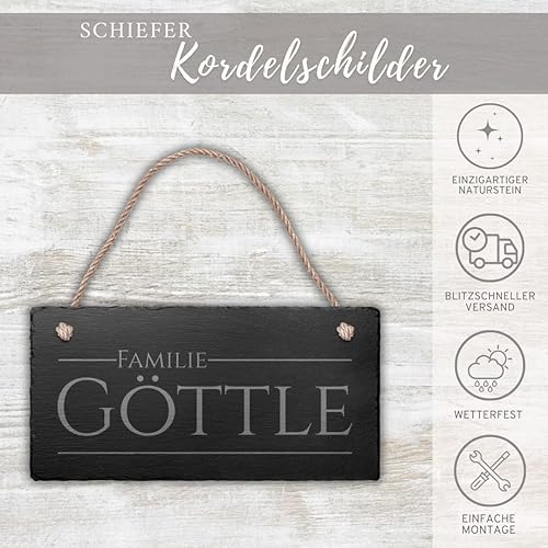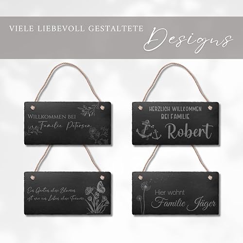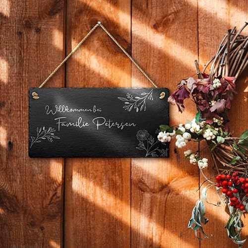 Schöne Schiefer Türschilder für die Haustür mit Gravur - 20x10 cm - Schiefer Schild mit Kordel zum Aufhängen - graviertes Haustürschild & Willkommensschild
