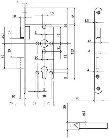 BKS Standard Zimmer Türschloss für Profilzylinder 55/72/8, Stulp: 20 x 235mm abgerundet, DIN Rechts incl. SN-TEC® Montageset