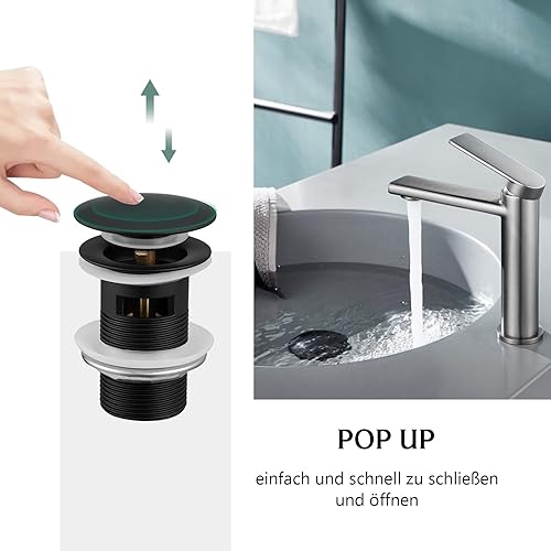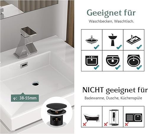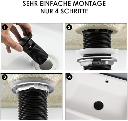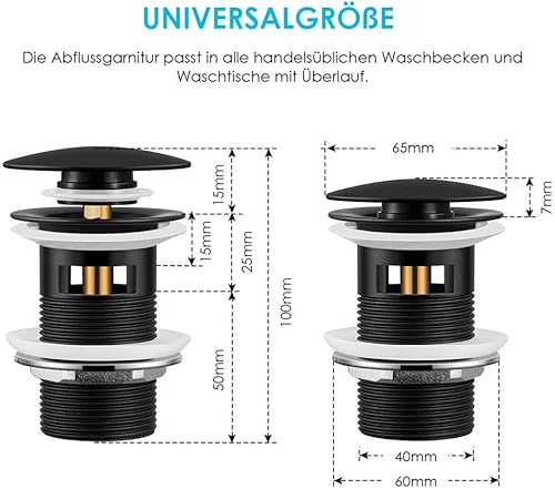 Universal Ablaufgarnitur Pop Up Ventil mit Überlauf für Waschtisch - Schwarzer Ablaufventil Abflussgarnitur für Waschbecken, Einfache Installation