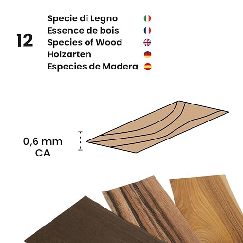 Kontrasti Furnier Set für Intarsien / 12 Holzarten x 24 Blatt Holzfurnier, fertig zum Basteln, Gestalten, Modellbau, restaurierung Holz DIY