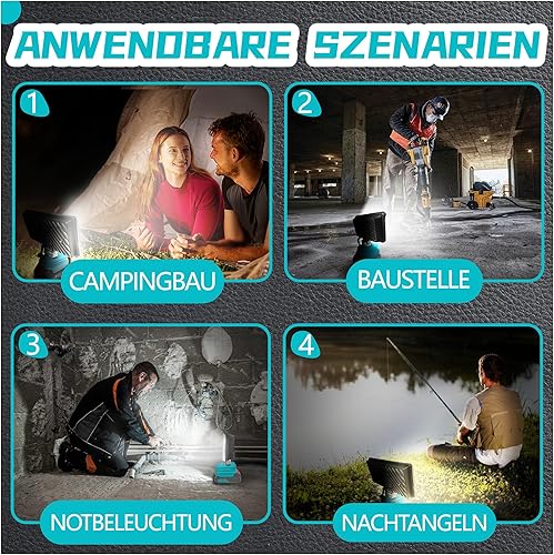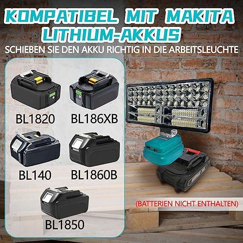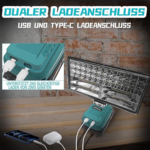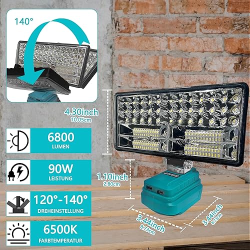 Akku Lampe für Makita 18V, 90W 6800LM Kabellose Arbeitsleuchte, 2 Modi LED Akku Strahler mit 2 USB-Aufladung, Tragbares Flutlicht für Notfälle, Baustelle, Camping, Autoreparaturen (kein Akku)