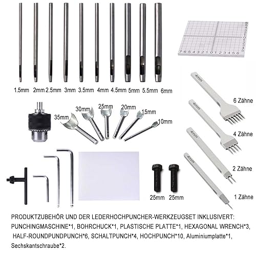 Leder Locher Werkzeug Guilopoer Lochmaschine mit Aluminiumplatte Set 4 Zinken + 10 Lochstanzern, PP-Plakette für Lederdruckmaschinen Stanzen Zinken Stempeln Punche,DIY Maschine zum Lochen von Leder