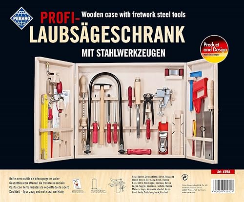 Pebaro 419A Profi-Laubsägeschrank, 31 Teile, komplettes Set im Holzschrank, Stahlwerkzeuge, Laubsägebogen made in Germany, Bohrmaschine, Basteln mit Holz, Laubsägen, Geschenkidee für Handwerker