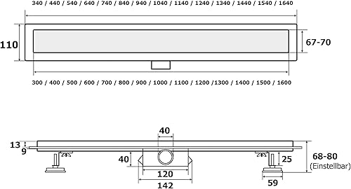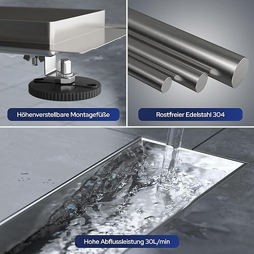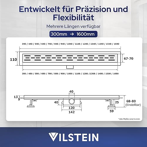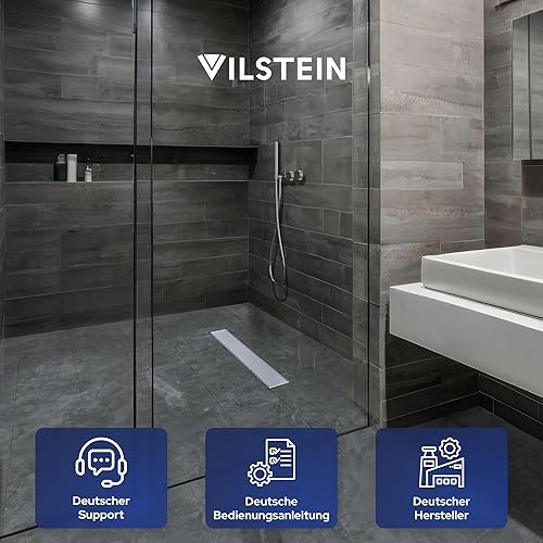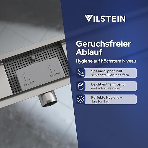 VILSTEIN Duschrinne 80cm, Edelstahl Bodenablauf Komplettset, extra flach, Siphon mit Geruchsstop, Haarsieb - Randablauf