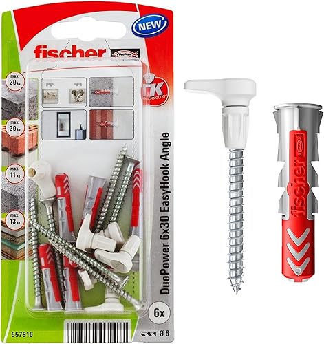 fischer EasyHook Angle K (4), Set aus 4 Winkelhaken-Schrauben und DuoPower, Spanplattenschrauben mit Haken, flexible Schraubhaken zur Montage in zahlreichen Baustoffen, 8 x 40 Dübeln