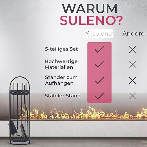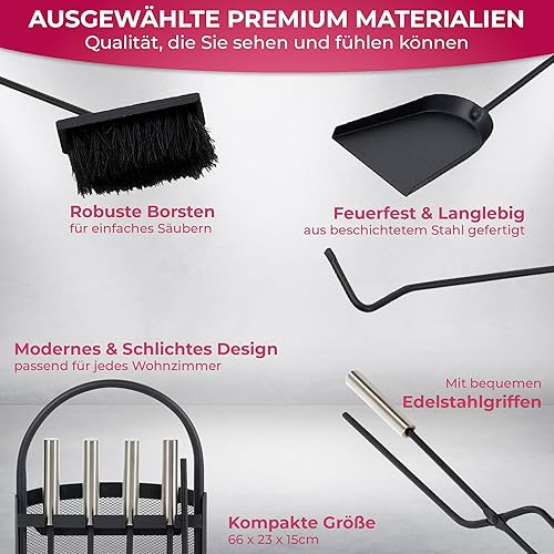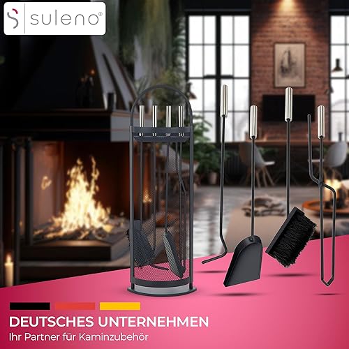 Suleno® Kaminzubehör BELFAST 5-tlg. Kaminbesteck Modern Edelstahl Schwarz Kamingarnitur Schaufel Schürhaken Zange Besen Ständer Ofenbesteck f. Kamin