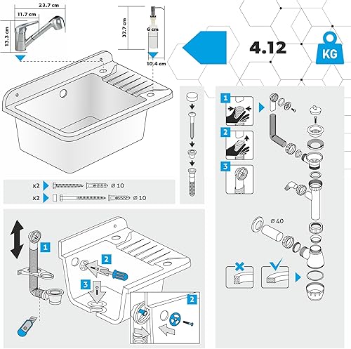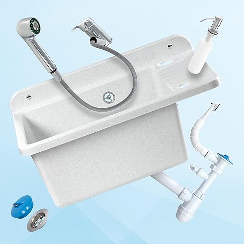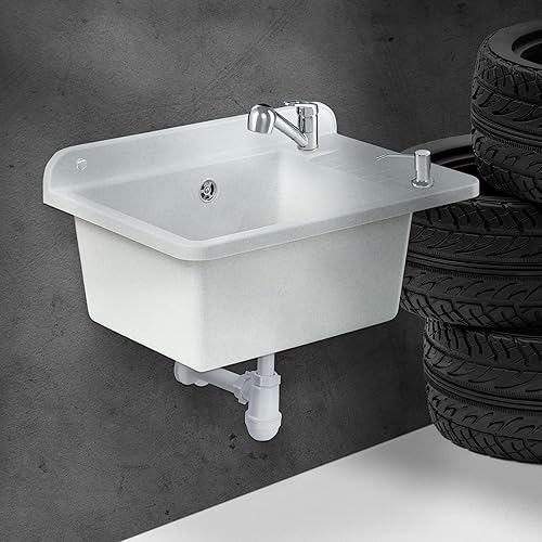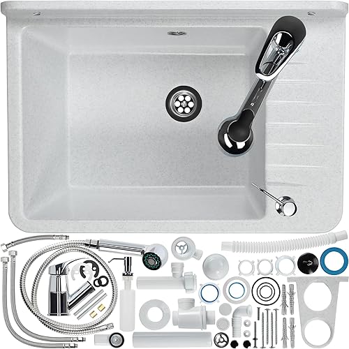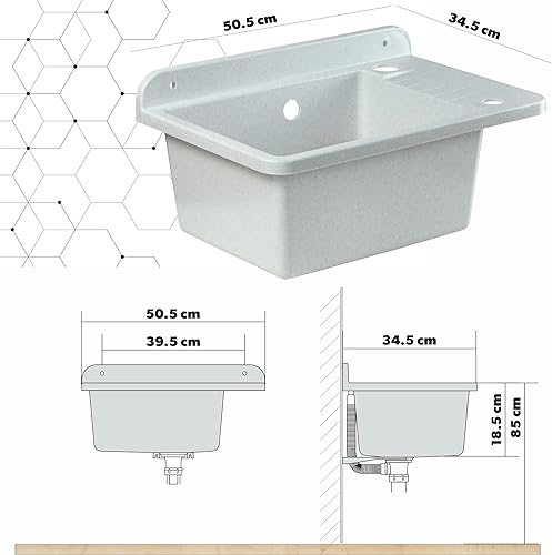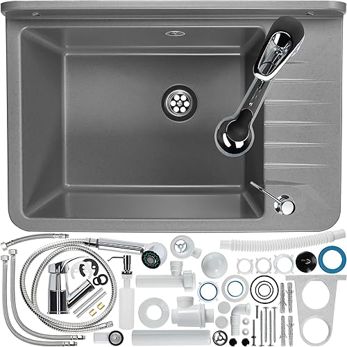 GOSPO Ausgussbecken aus Polypropylen, 50,5 x 34 x 26,5 cm, Spülbecken mit Armatur, Siphon, Seifenspender, Waschbecken, Haushaltsspülbecken (Grau)