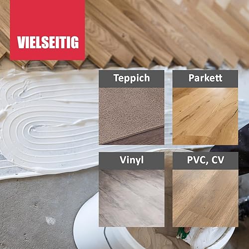 Bodenkleber 5kg - Universalkleber Teppich, PVC, CV, Linoleum, Kork, Vinylboden kleben, Parkett Kleber - lösemittelfrei, emissionsarm, Klebemittel für Fußbodenheizung © DICHTON D.80W