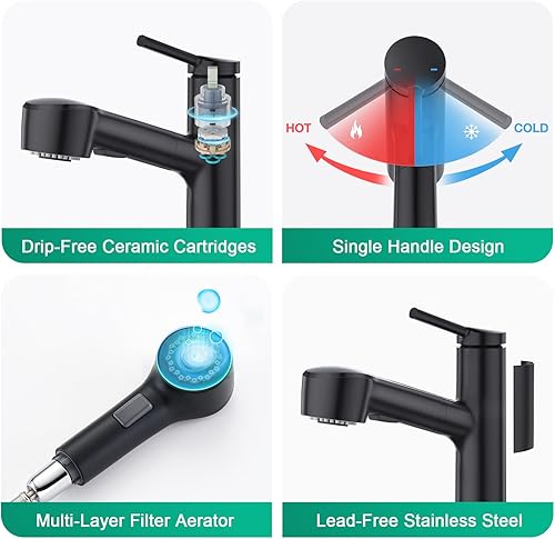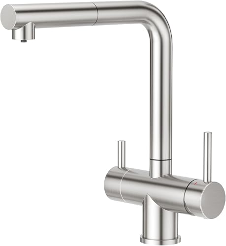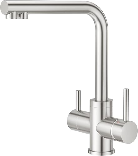 CREA 3 Wege Wasserhahn Küche, 360° Drehbar Küchenarmatur, 3 in 1 Mischbatterie für Wasserfilter, Trinkwasserhahn mit 2 Hebel, Drei Wege Armatur Küche aus Edelstahl,Gebürstete Oberfläche