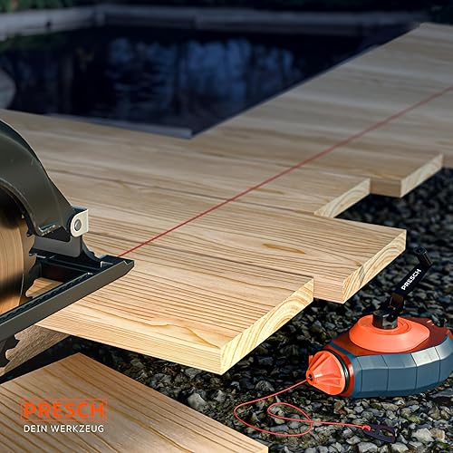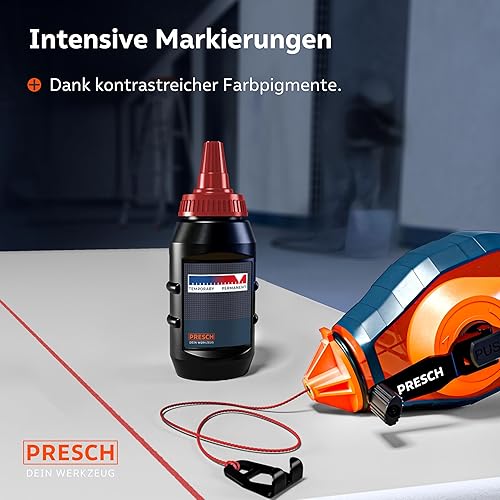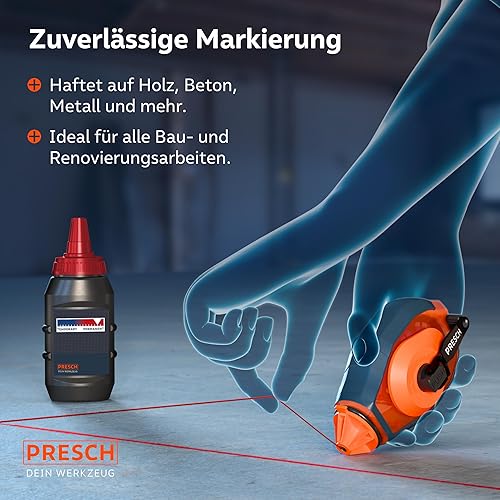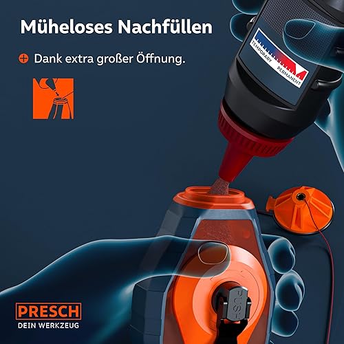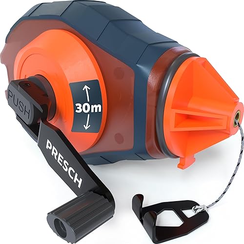 PRESCH Schlagschnur 30m - Schneller Rücklauf dank 6:1 Getriebe - Strapazierfähige Schnur für exakte Linien - Einfache Füllstandskontrolle durch Sichtfenster - Kurbelarretierung für optimale Spannung