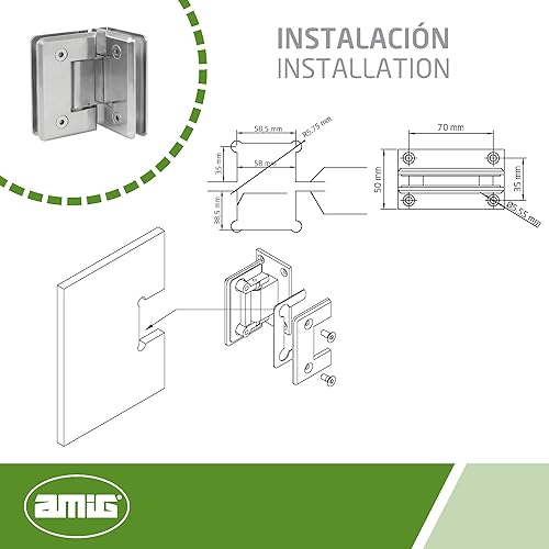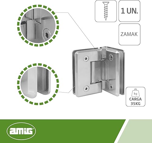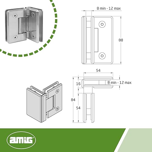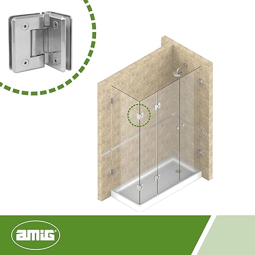 Amig - Zamak Duschscharnier fest | 88 x 54 mm | Modell B | Nickel matt | Geeignet für Duschabtrennungen aus Glas | 8-12 mm Dicke | Maximale Belastung pro Paar: 35 kg