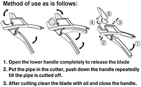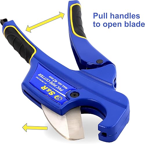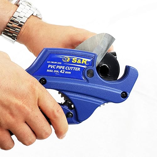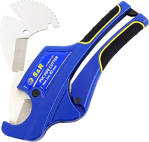 S&R Rohrschneider mit 2 Klingen, Ratschen-Rohrschere, Leitungsschneider für Kunststoff-Rohre bis 42 mm (1 5/8 Zoll) aus PVC, CPVC, PE-X, PE, PP-R, Edelstahl-Klinge HRC 54, Ergo-Griffe, Ersatzklinge