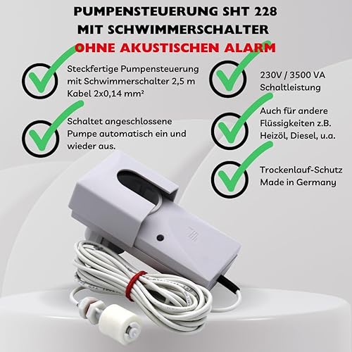 Schabus 300218 SHT 228 Wassermelder zur Pumpensteuerung ohne Akustischem Alarm. Gerät schaltet angeschlossene Pumpe bei Wasserkontakt EIN und nach einstellbarer Nachlaufzeit wieder AUS.