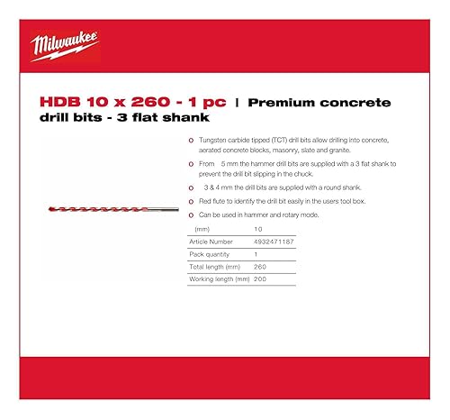 Milwaukee 4932471187 Premium-Betonbohrer, Schaft mit 3 Seiten, Durchmesser 10 mm, Länge 260 mm