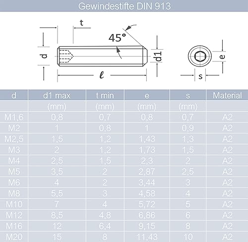 Gewindestifte mit Innensechskant u. Kegelkuppe M8x50 mm aus Edelstahl A2 (10 Stück) | DIN 913 - Madenschrauben - Wurmschrauben von MESAROS®